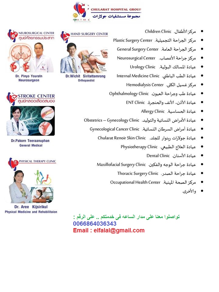 + حتى نتمكن من تلبية الخدمة لكم على اكمل وجه يستوجب عليكم قبل الحضور إلى تايلاند إن أردتم التعرف على التكلفة الإجمالية لعلاجكم نطلب منكم إشاعات وتقارير الحالة المراد علاجها وعرضها على الطبيب المختص وسيتم إعلامكم فورا بالتكلفة ومدة العلاج إن شاء الله